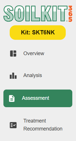 - Assessment Tab: Here, amendment needs are calculated based on a unit of measure, which defaults to pounds per 1,000 square feet unless adjusted by the user. You can switch to pounds per acre or ppm using the units toggle at the top right.
